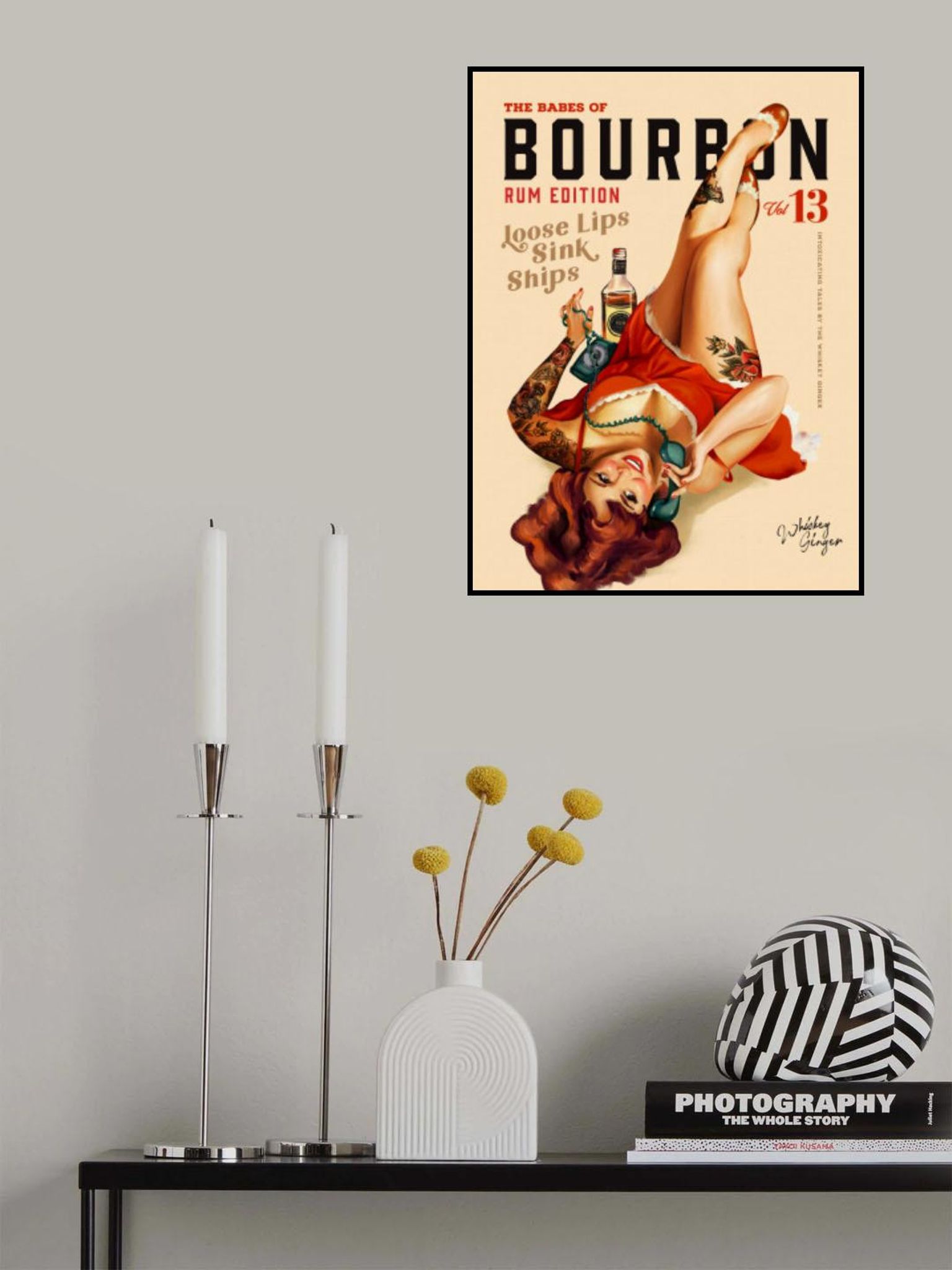 - Biografi: Whiskey Ginger är ett designmärke baserat på den vackra bergsstaden Bozeman, Montana. De syftar till att ge en touch av analog värme till en allt mer digital värld, och strävar efter att berätta visuella historier som väcker en nostalgisk känsla av tid och plats. Gång på gång, grundarna finner whisky att vara ett oumbärligt verktyg i våra kreativa strävanden. Det är därför de känner namnet på sin verksamhet, Whiskey Ginger, är så passande. Det handlar om kreativitet och allt som går in i det- ta ut den kreativa strävan, och du har fortfarande något att smutta på. Whiskey Ginger varumärke har allt: från sexiga pinup konsttryck och vintage reseaffischer, att kyla cowgirl mönster och whisky vägg konst för din hem bar eller vardagsrum. "Vi älskar att höra från fans av vårt arbete- kolla oss ut på vår Instagram @whiskeygingergoods. Skål!"