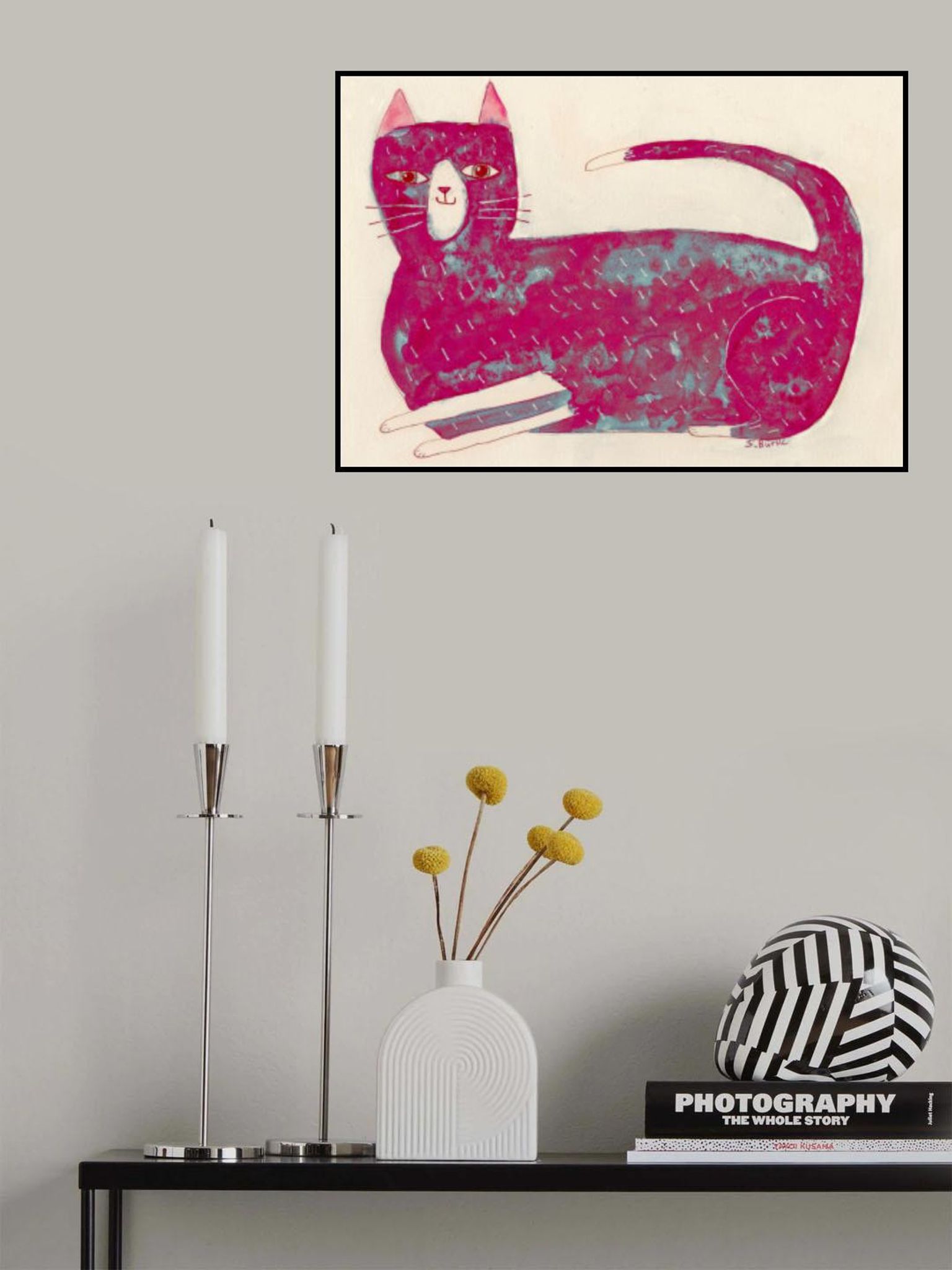 - Biografi: Sharyn Bursic är en självlärd, naiv bildlig konstnär vars verk fångar skönheten och humorn i vardagen. Med ett lekfullt och intuitivt tillvägagångssätt, skapar Sharyn livfulla, känsloladdade målningar med hjälp av en rad olika medier, inklusive akvarell, akryl och olja. Hennes arbete är fyllt med nyckfulla men hjärtliga skildringar av vardagliga ögonblick – oavsett om det är en katt som ligger på knä, människor som njuter av en lugn kväll med ett glas vin, eller djur fångas i en uppriktig, avslappnad stund. Sharyns distinkta stil ger en känsla av värme och charm till bekanta scener, ofta infunderad med en subtil känsla av humor. Hennes figurativa verk är både intima och tillgängliga, inbjudande tittare att se de extraordinära i de enkla, dagliga aktiviteter som definierar våra liv. Förutom hennes bildliga bitar, utforskar hon också abstrakt målning, där hennes lekfulla användning av färg och form fortsätter att återspegla den glädje hon finner i världen runt henne.