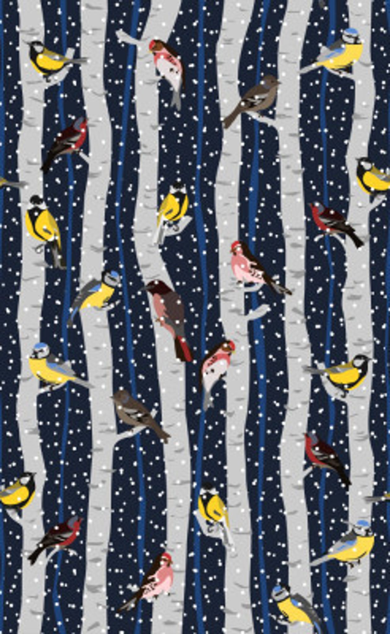 Birds in snowy birchwood on navy blue pattern
