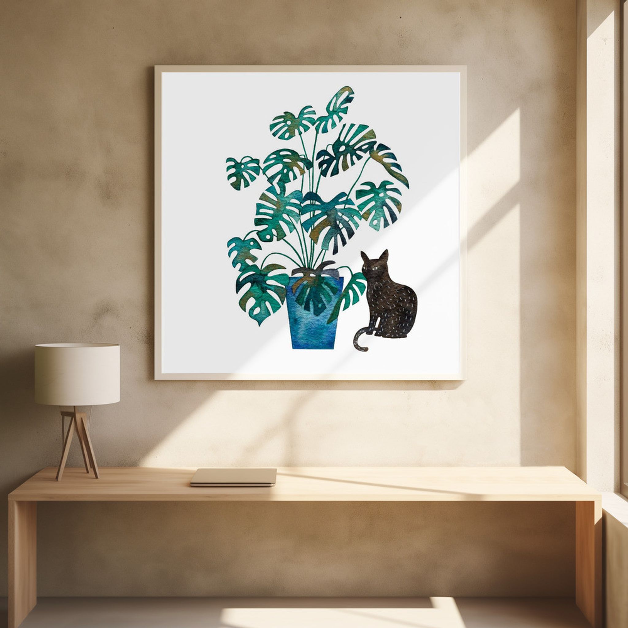Black Cat With Monstera Plant