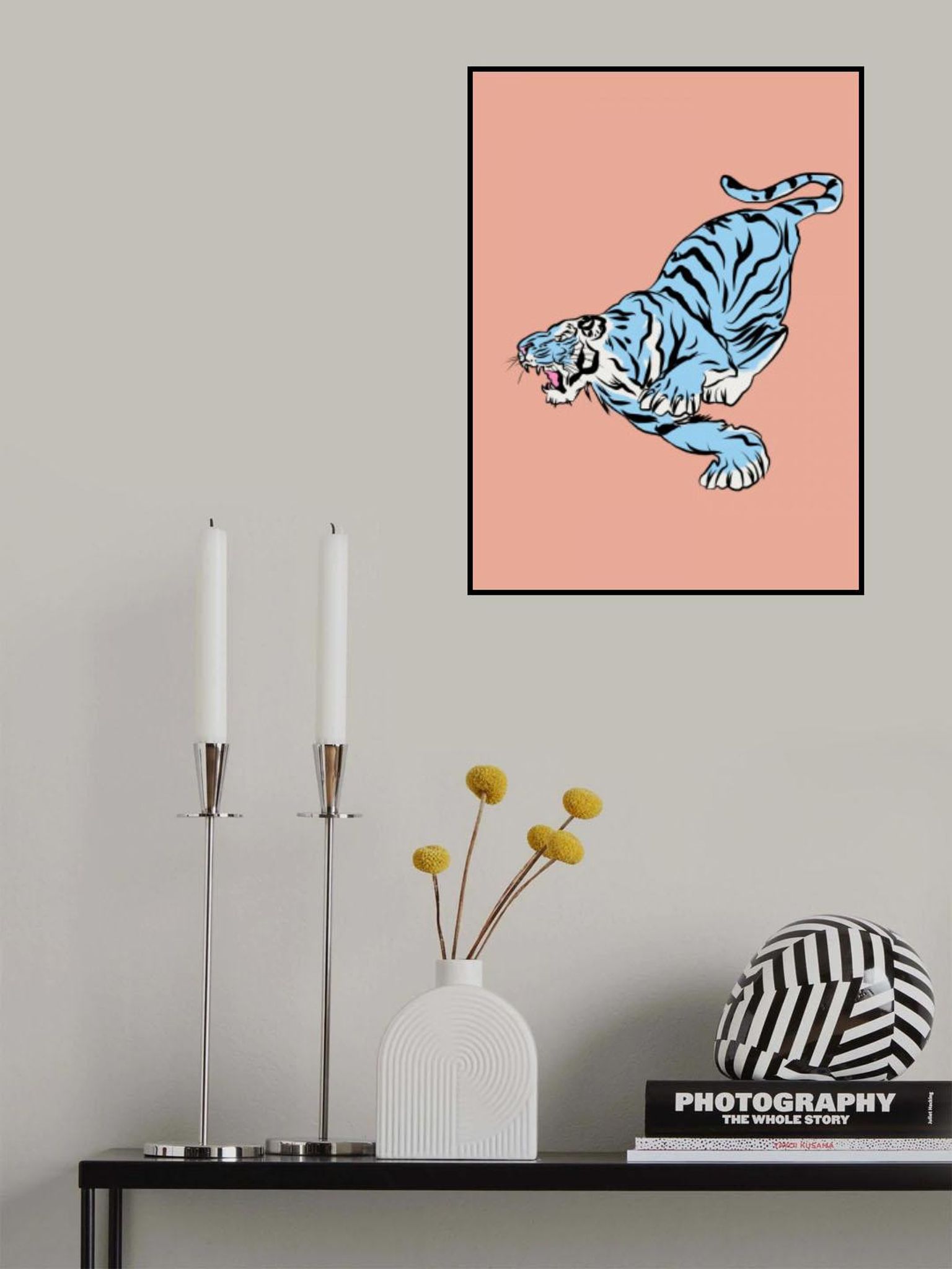 Blue Tiger Leaping Against A Soft Pink Background