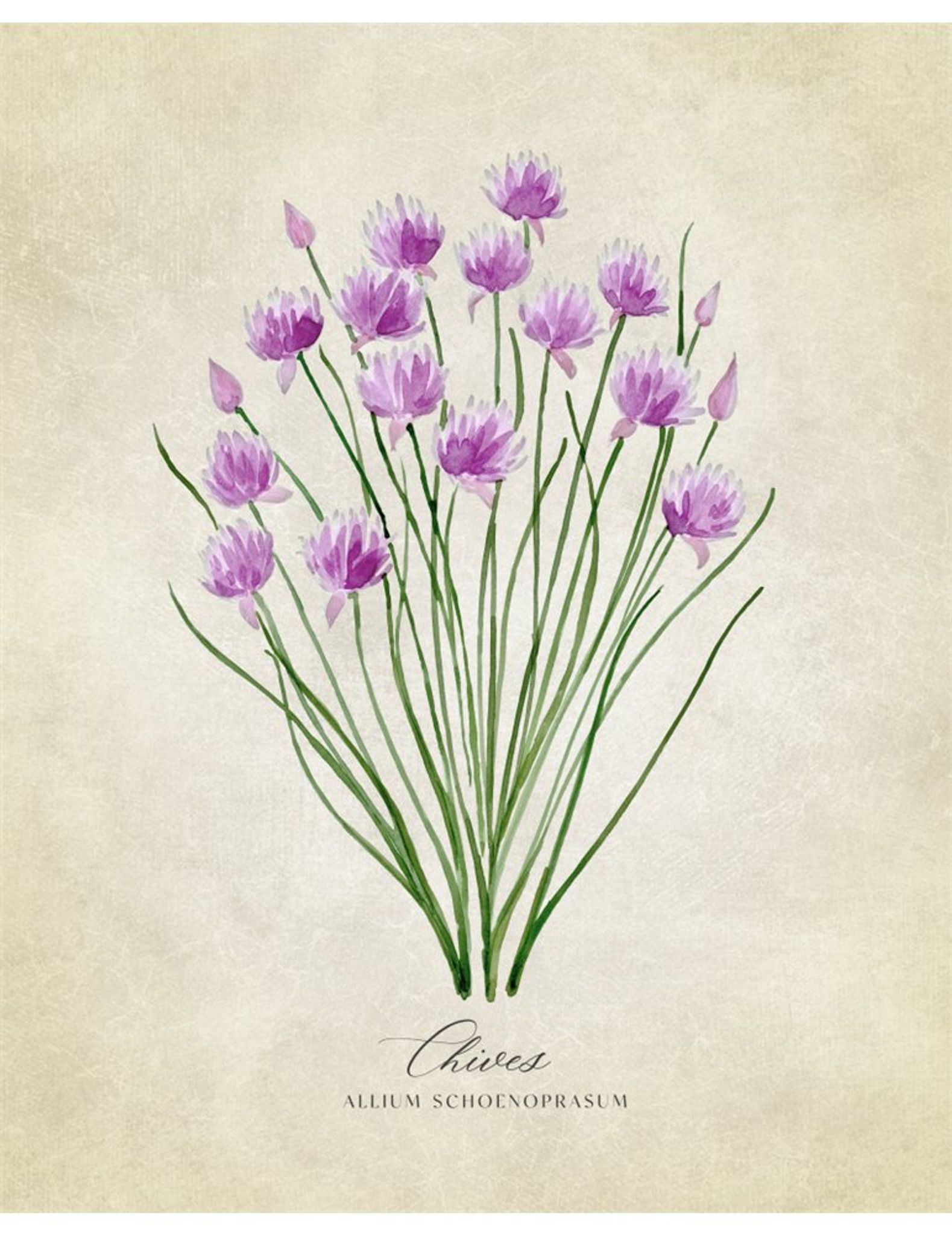 Chives vintage är en vacker poster i äldre stil som visar på när gräslöken blommar i sina fina lila blommor. Passar perfekt i köket eller vid matbordet.