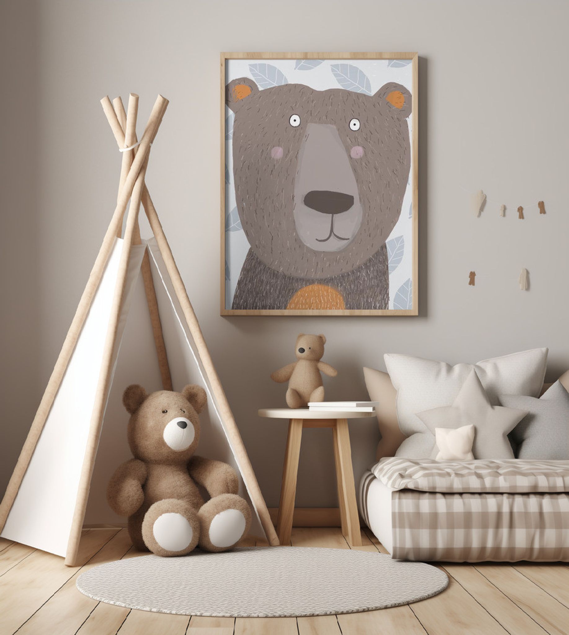 Cute Brown Bear with Grey Leaf Pattern by Artist Carla