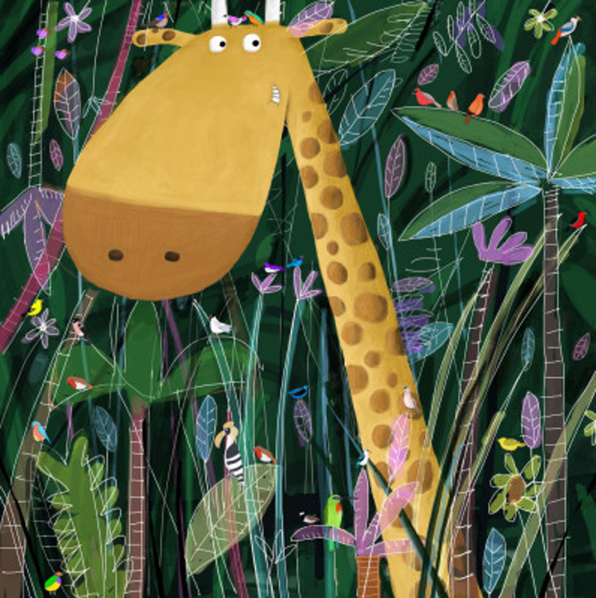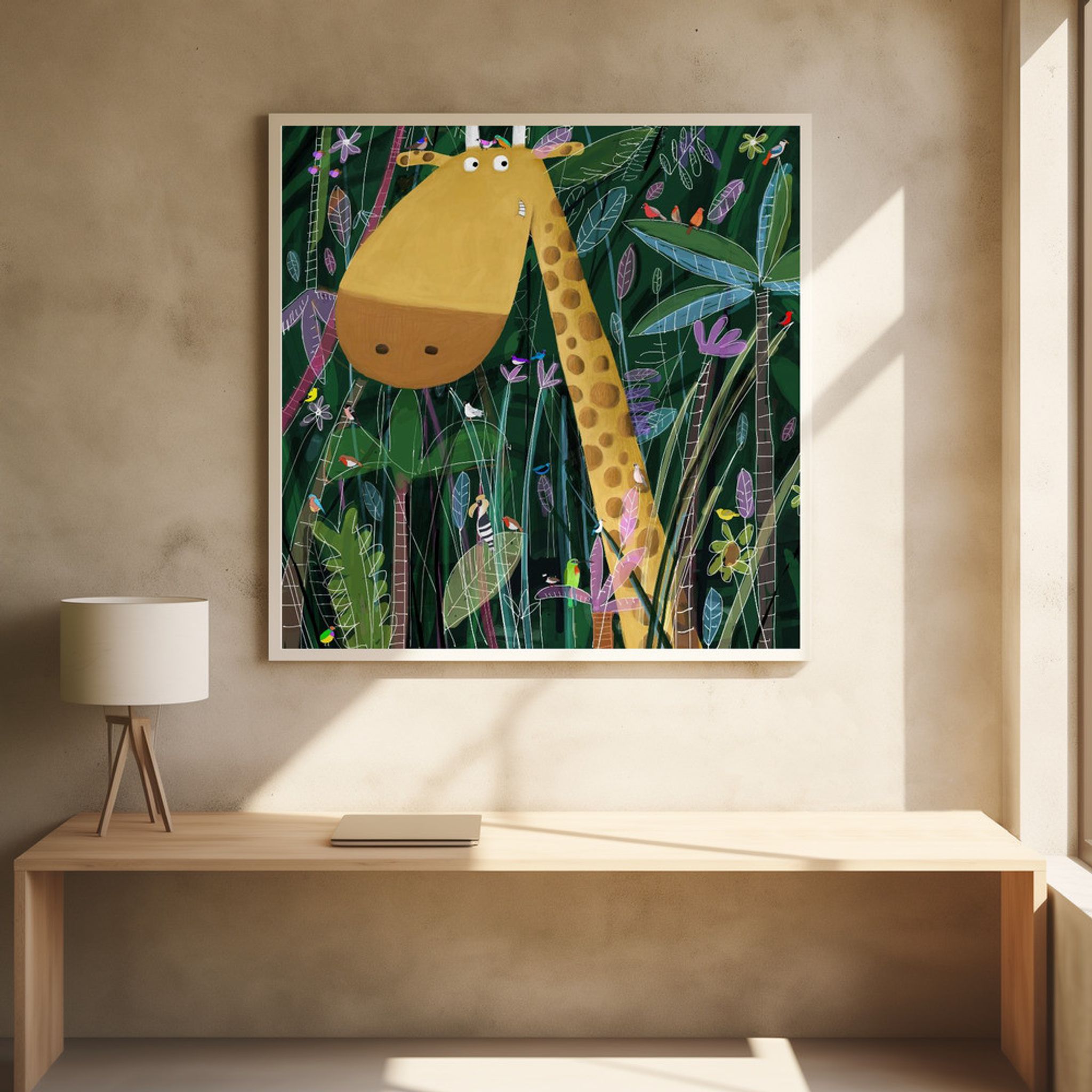 Cute Giraffe Peeks Out of the Jungle by Artist Carla Daly