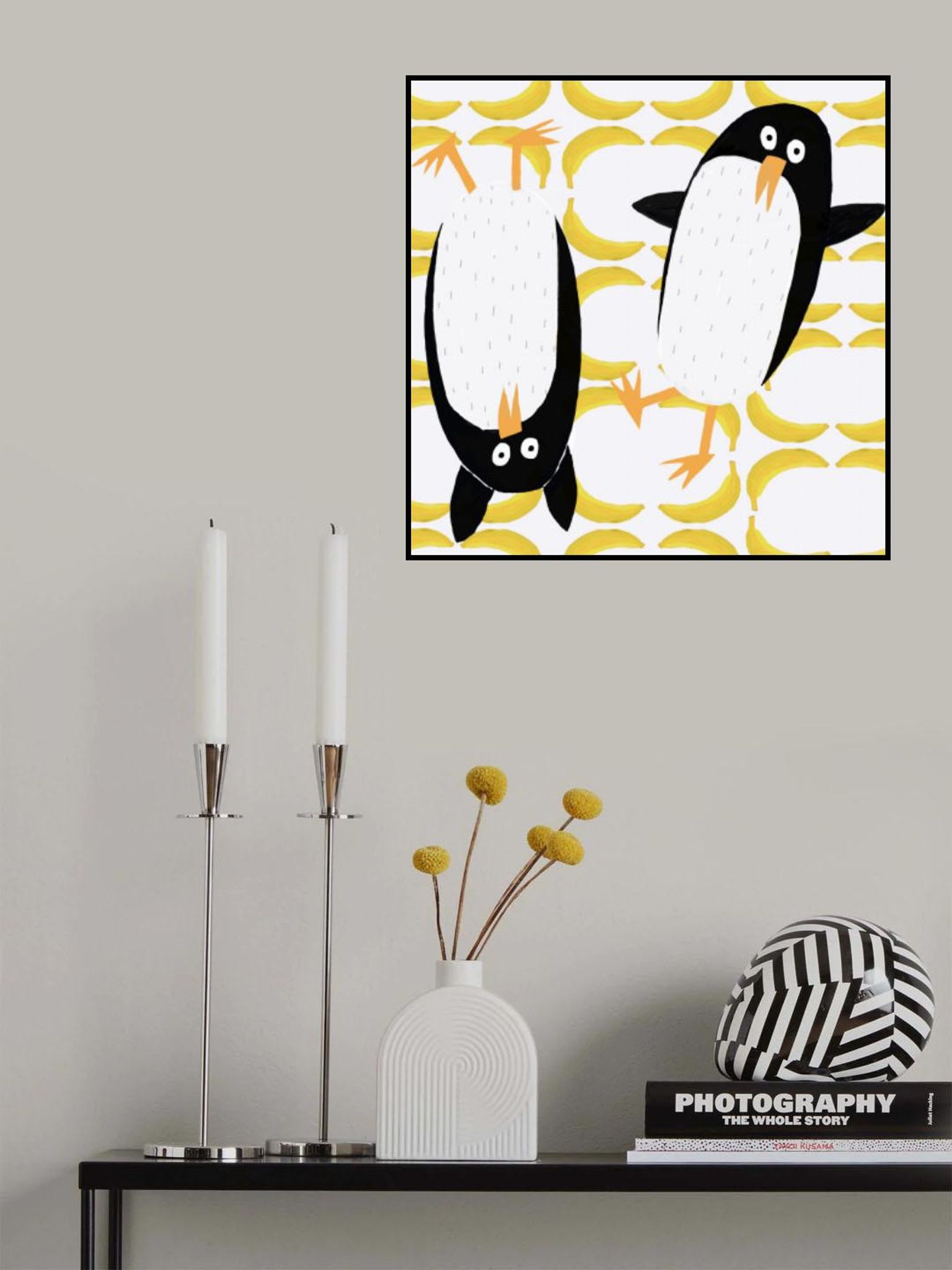 Funny Penguins with Banana Pattern Background by Carla Daly