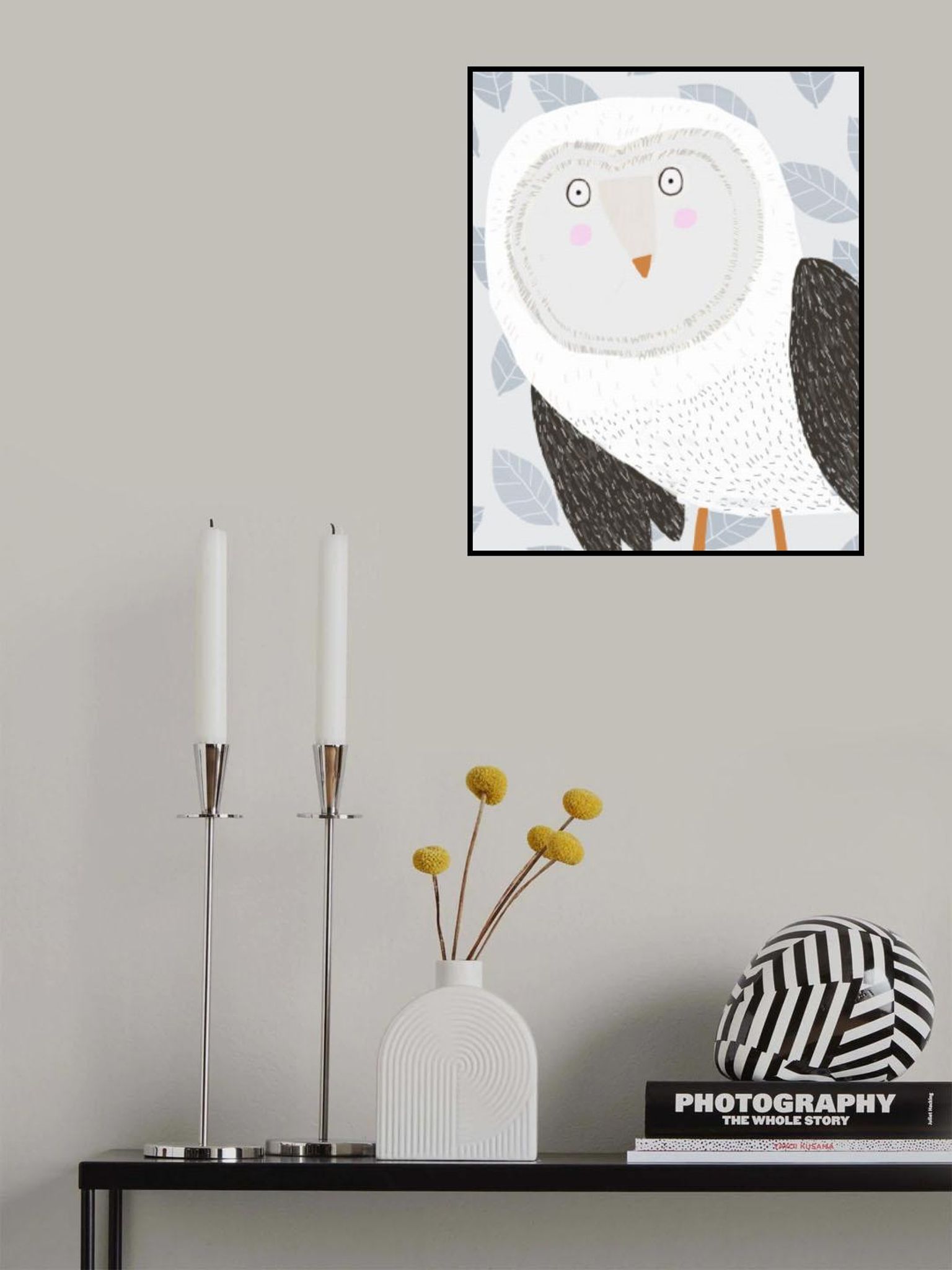 Funny Winter Owl with Grey Leaf Pattern by Artist Carla Daly