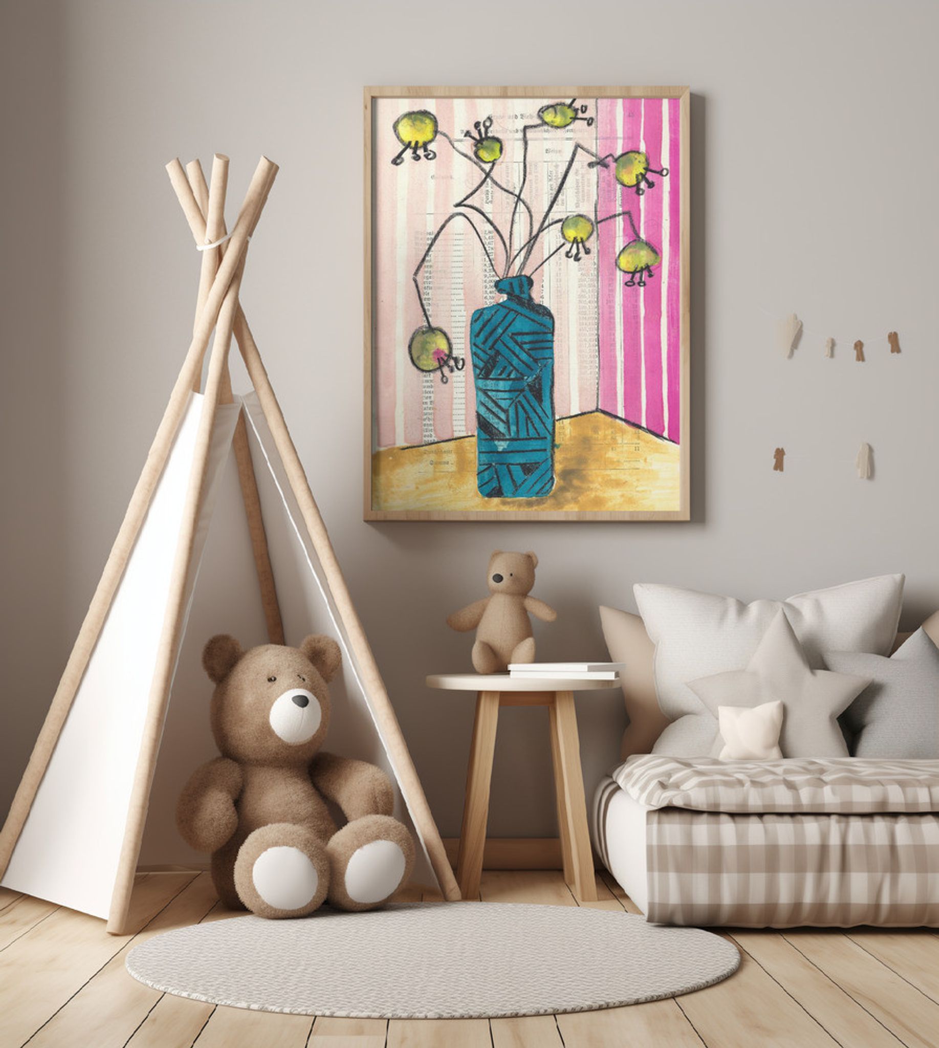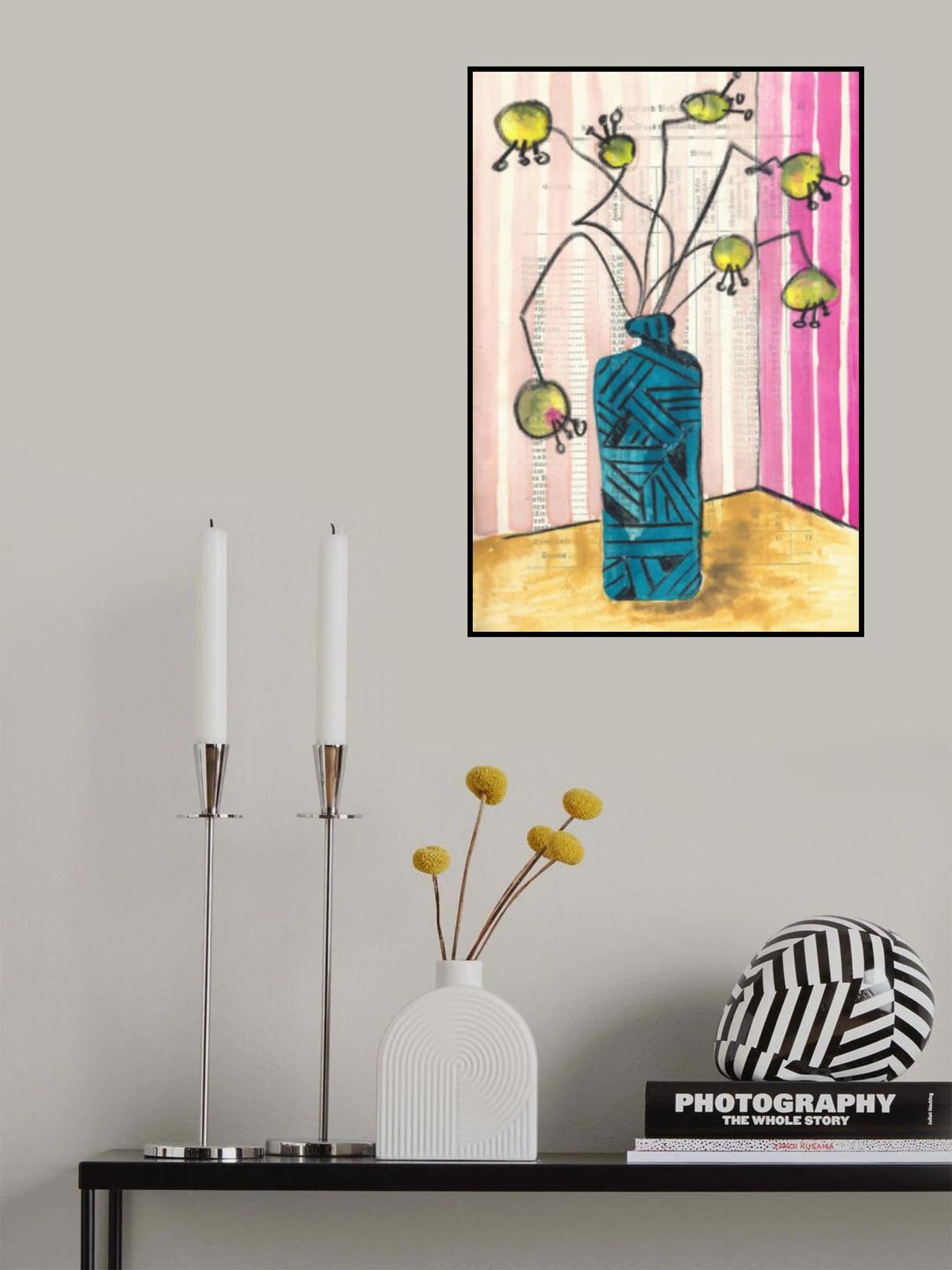 Hand-painted crazy flowers in a vase midcentury still life
