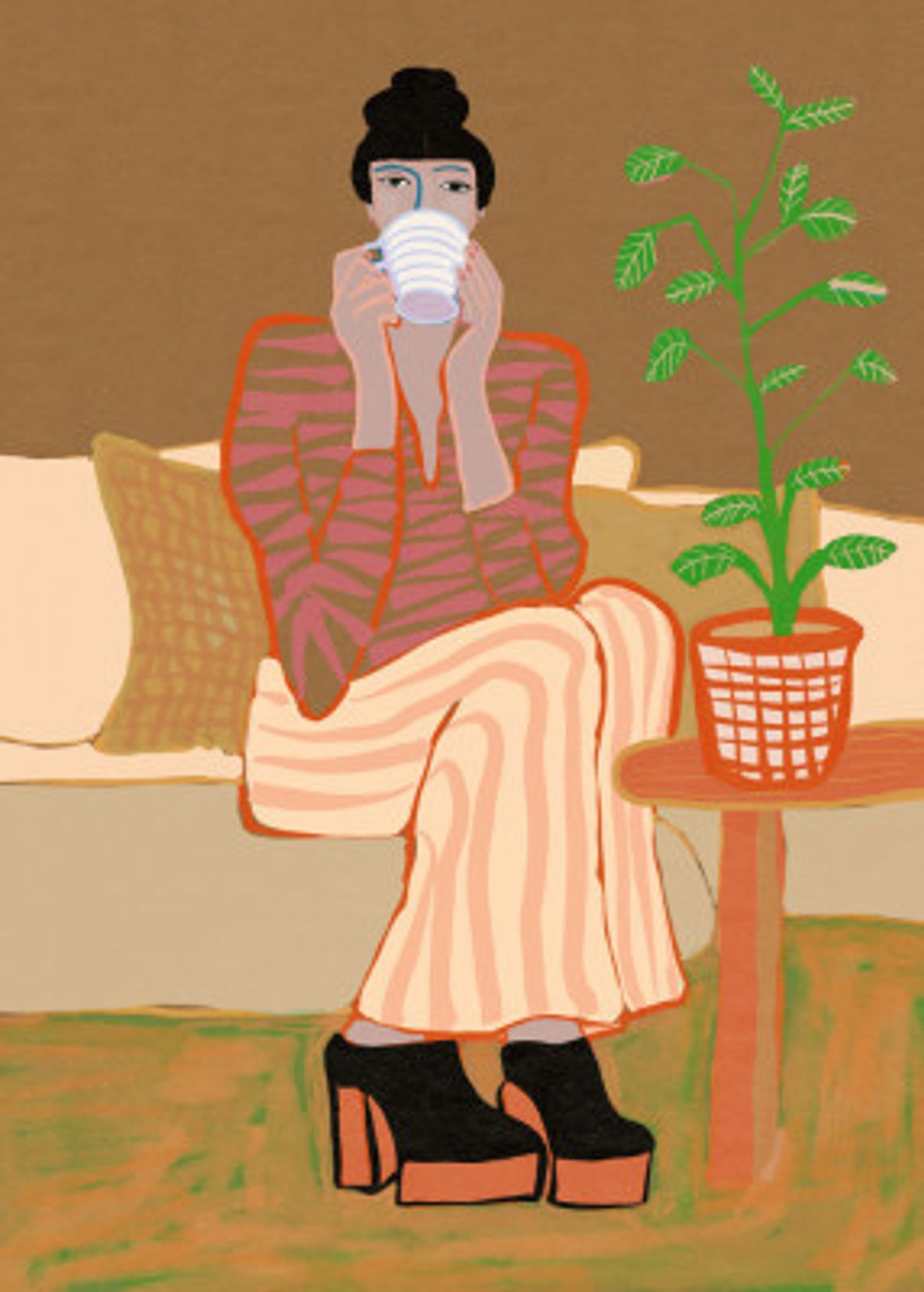 Lady having coffee Woman Sitting with pot plant