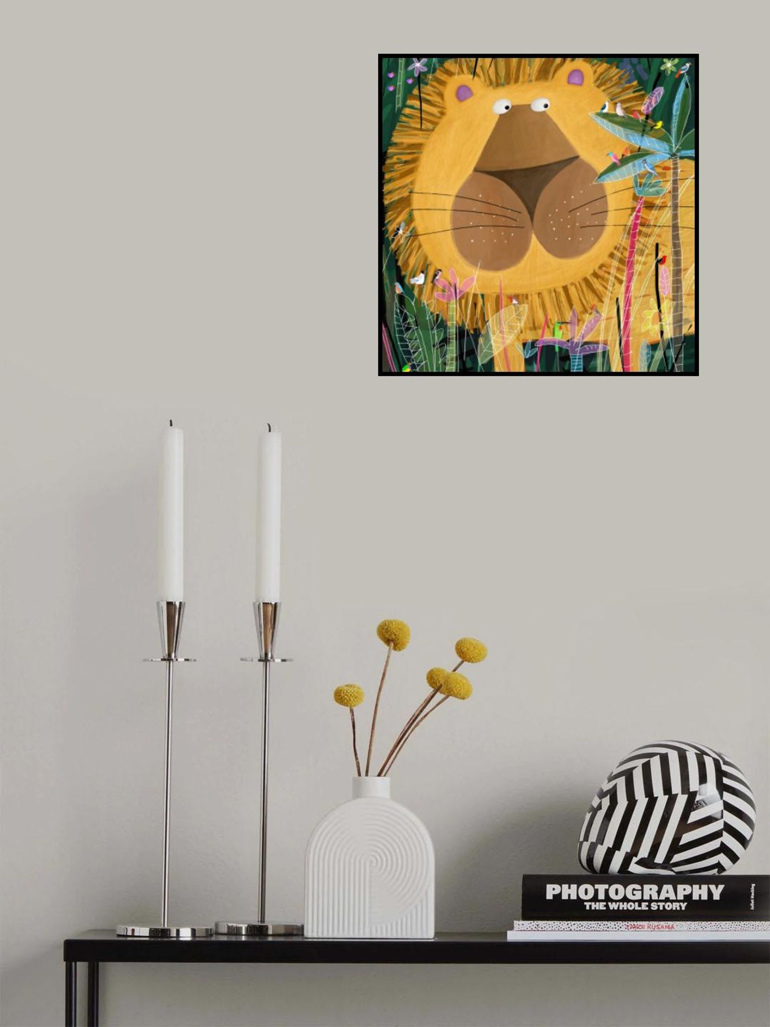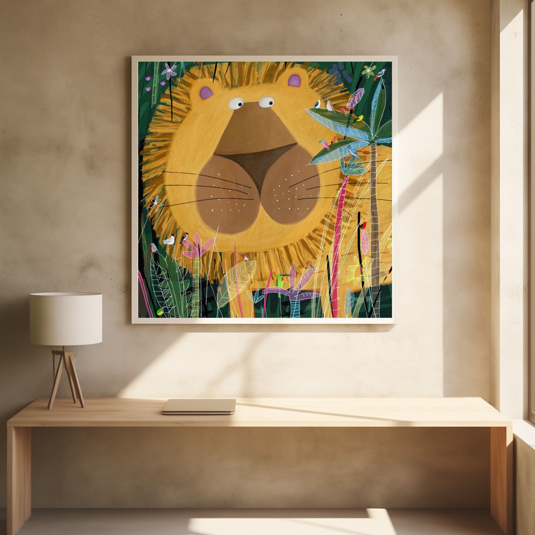 Large Lion Peeks Out of the Jungle Foliage by Artist Carla Daly