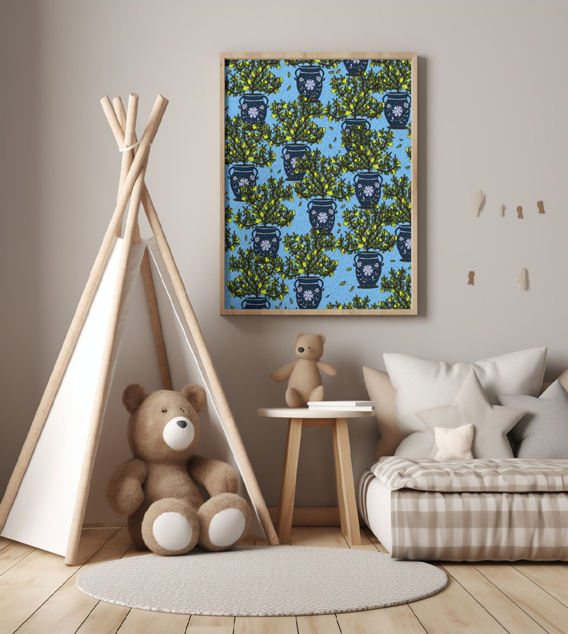Lemon Trees in Ornate Blue Vases