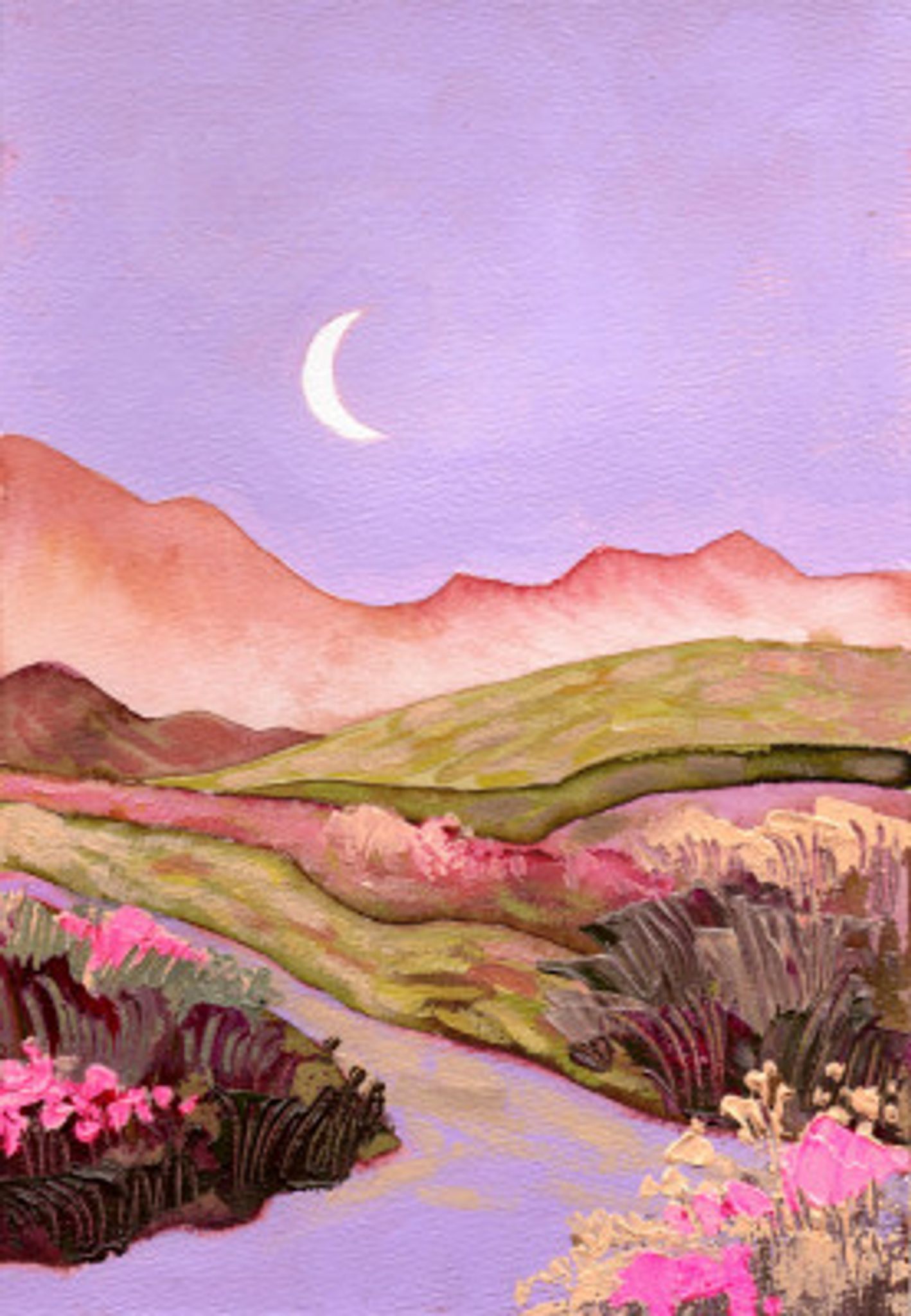 Lilac Sky and Moon Over Flowery Pink Green Fields Landscape