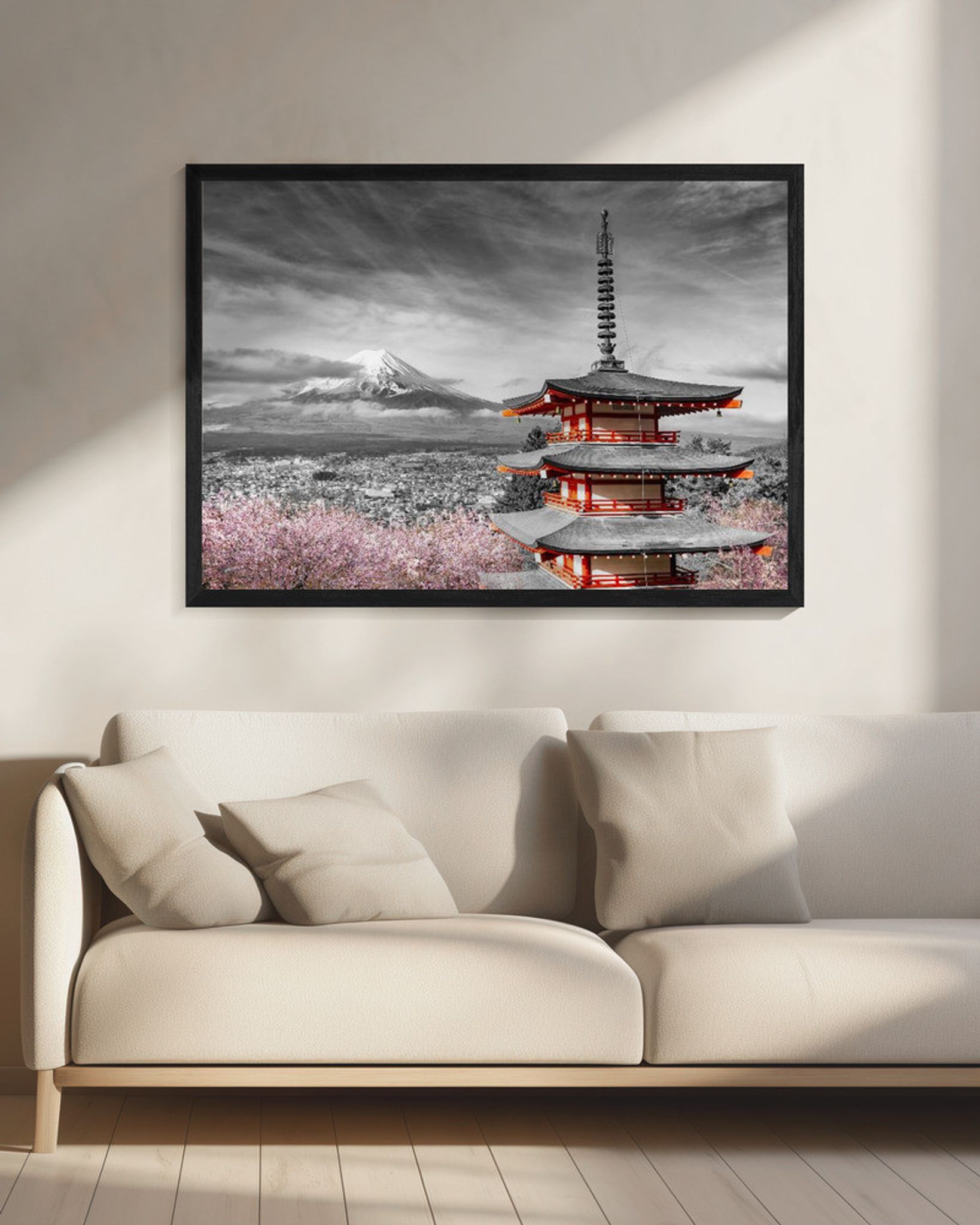 Magnificent view of Mount Fuji with Chureito Pagoda during cherry blossom season - colorkey