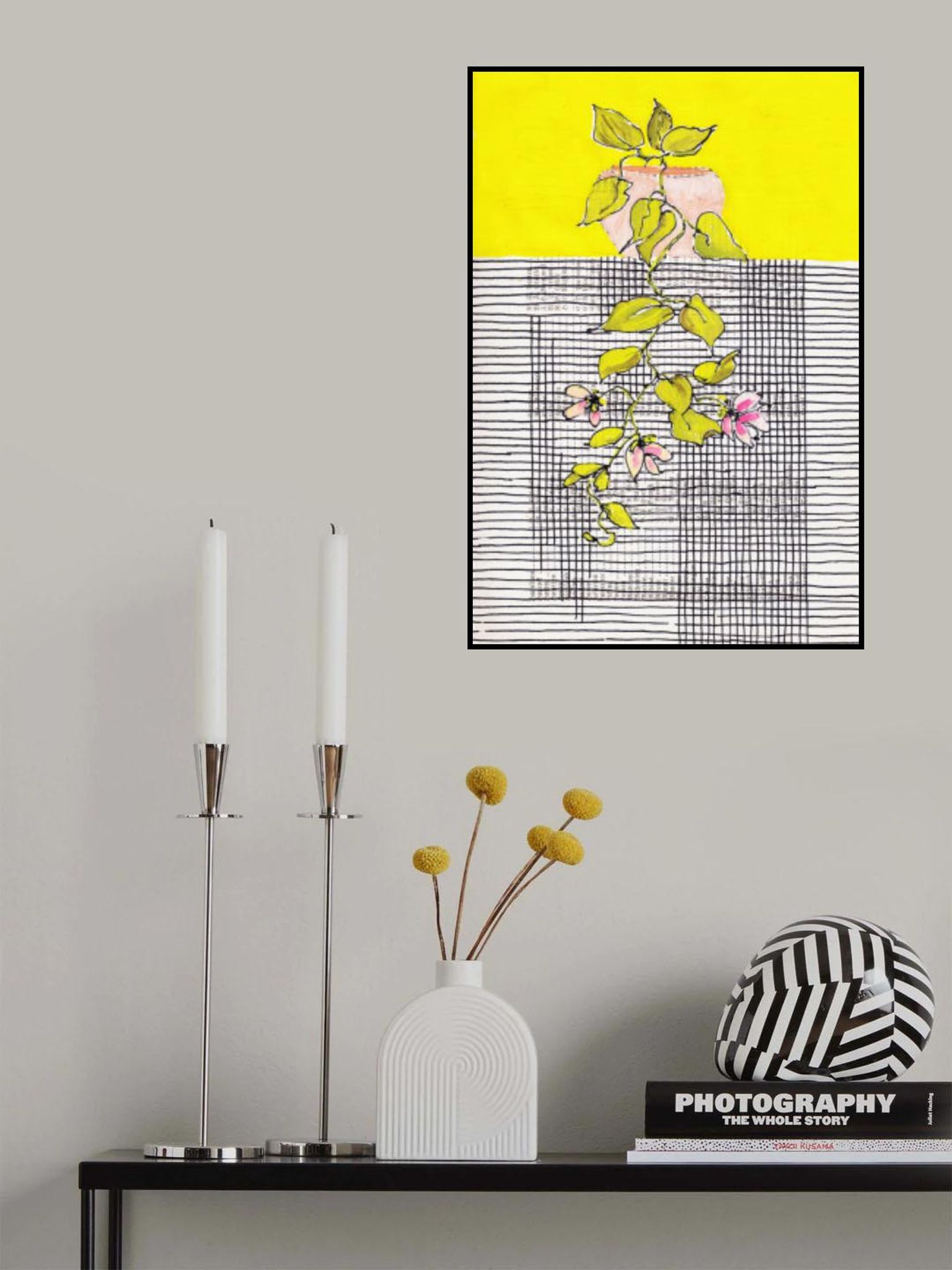 Mid century modern hanging plant in front of lines