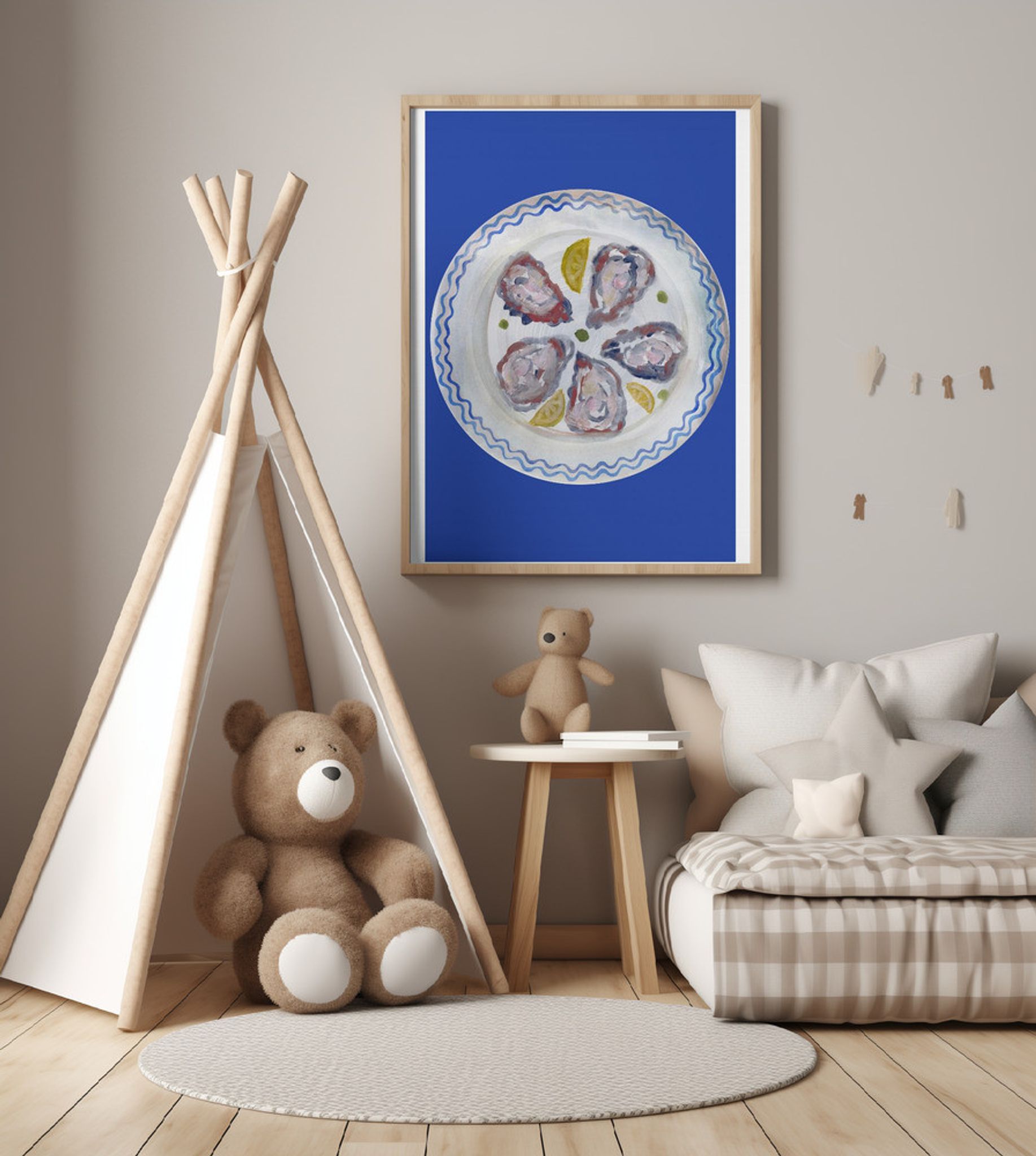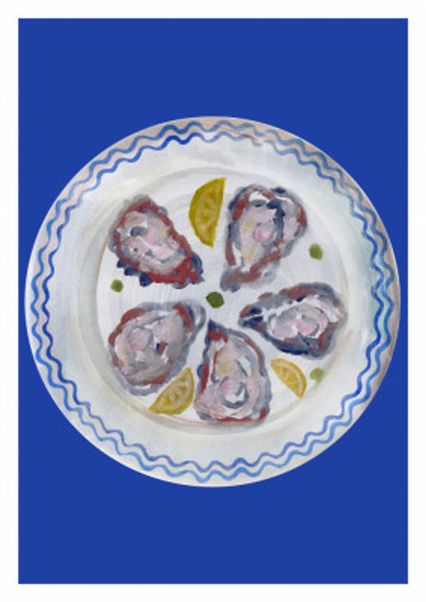 Oysters and Lemon on Blue Plate