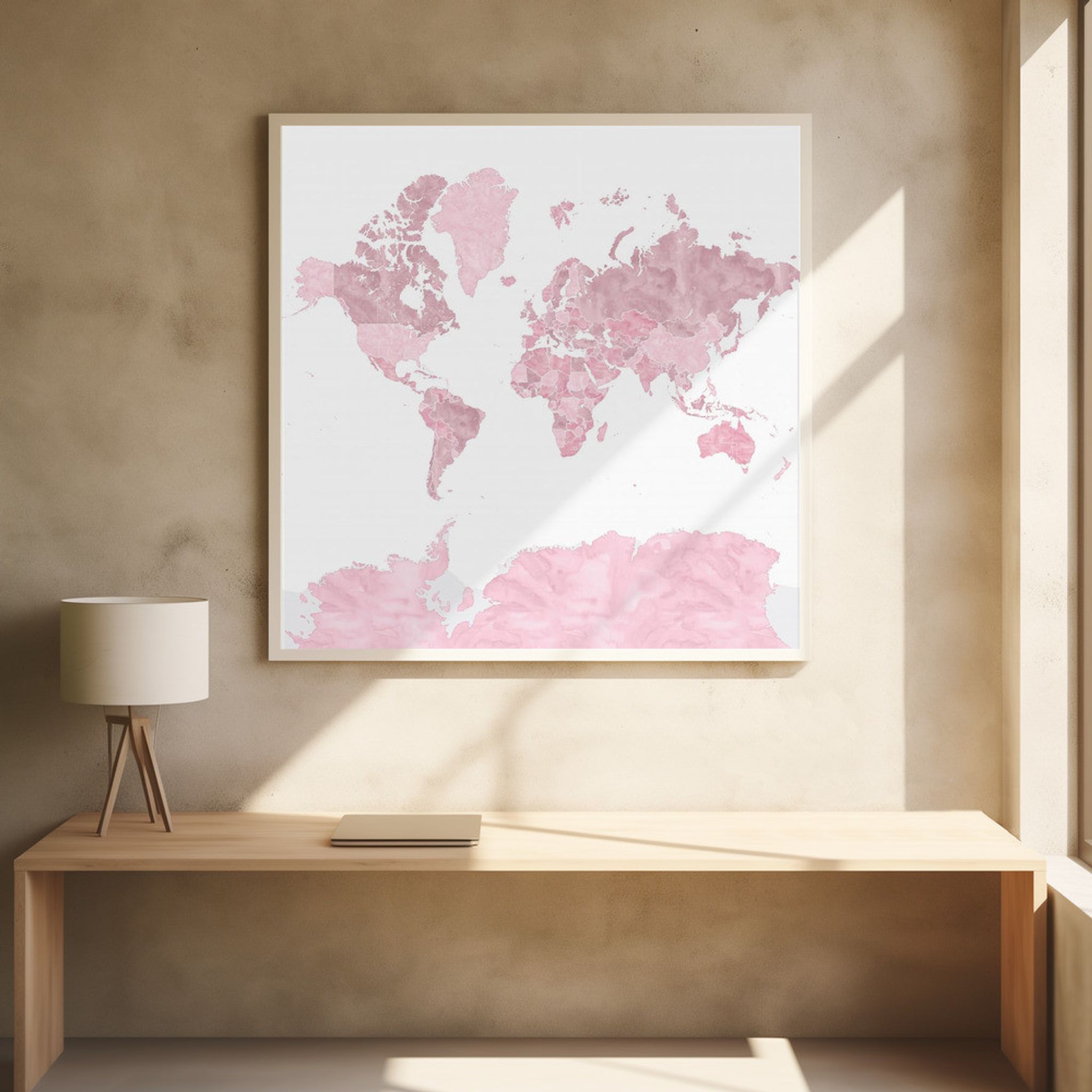 Pink watercolor world map with outlined countries, Melit