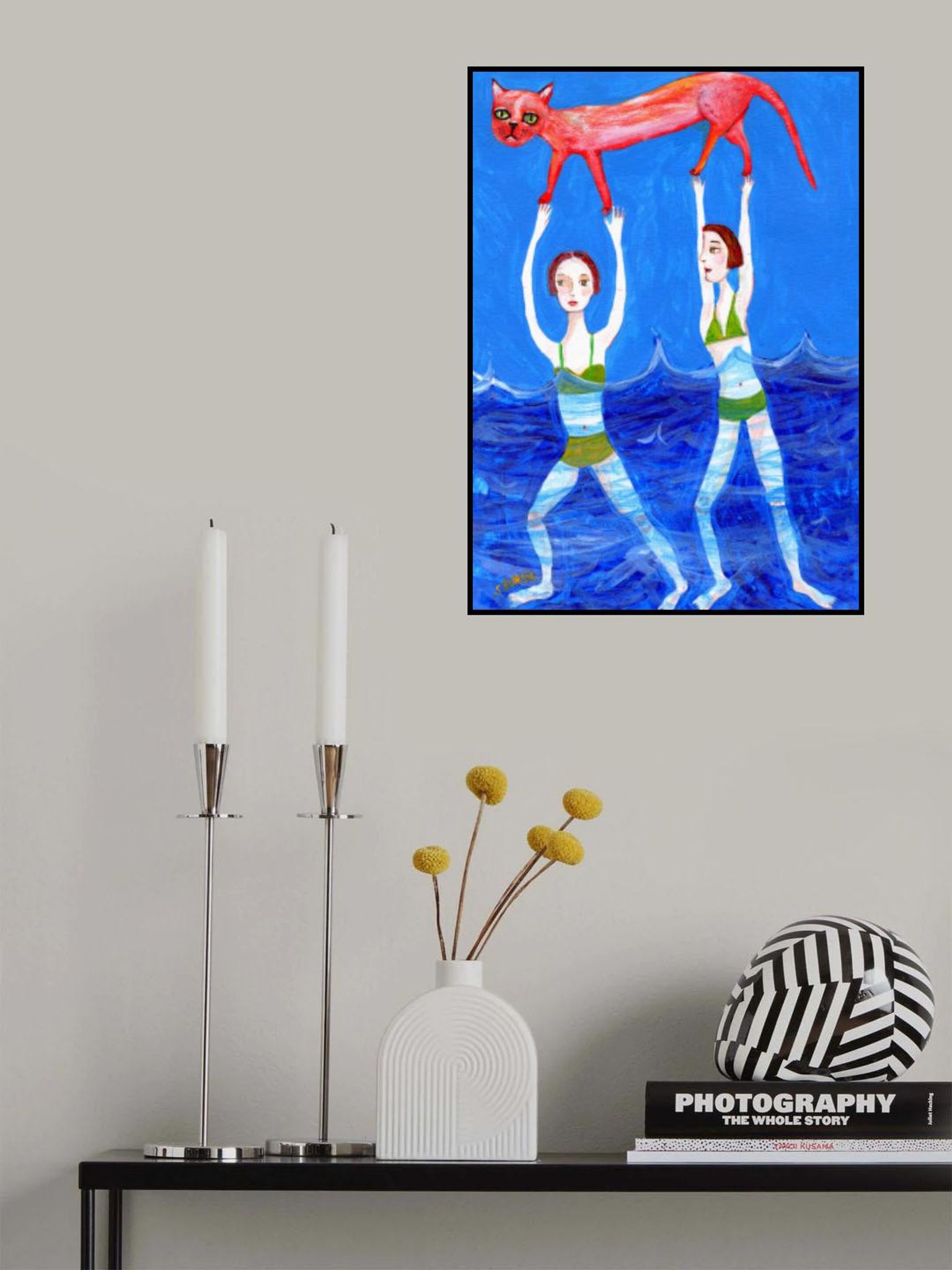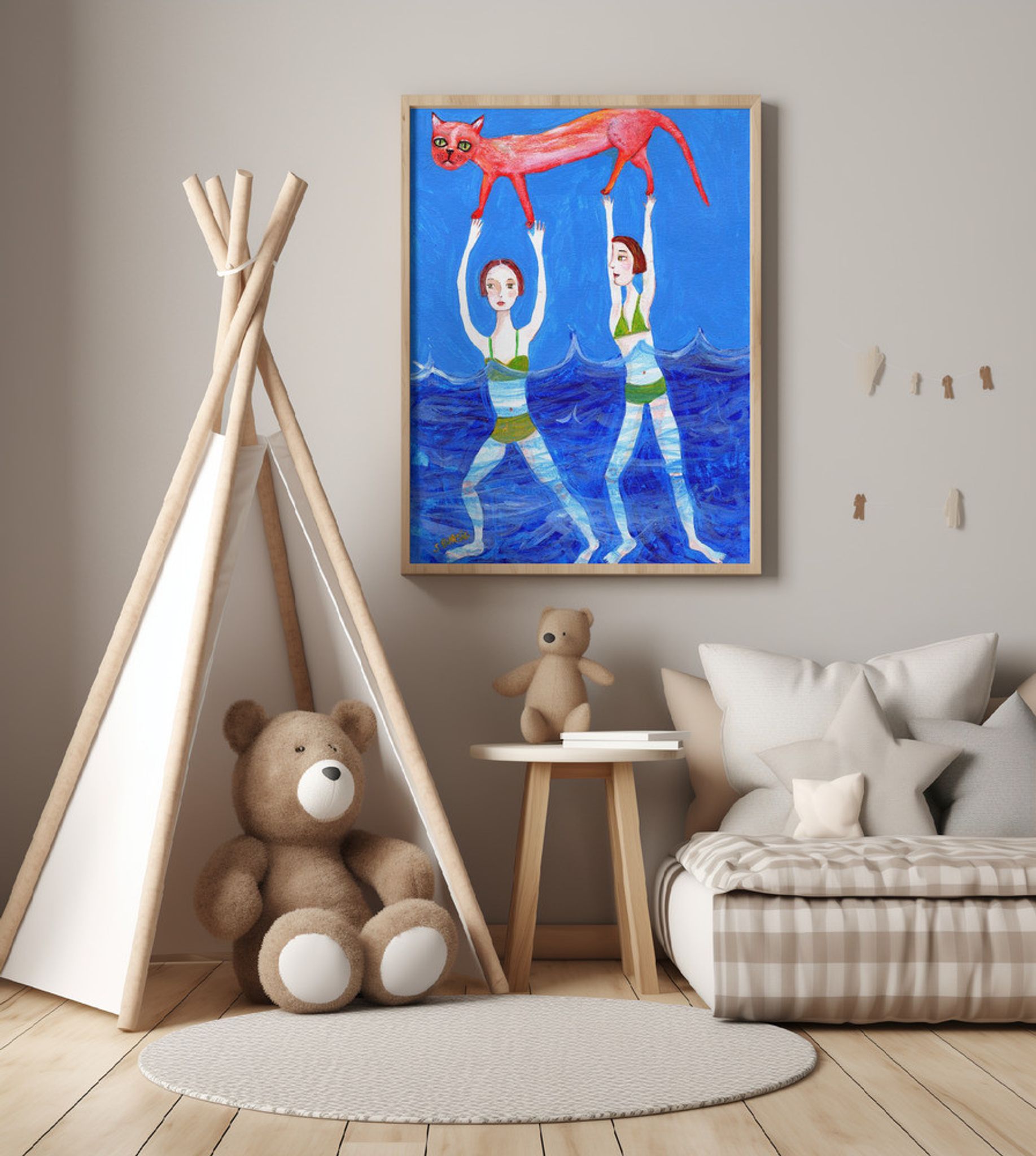 Two swimmers with pink cat