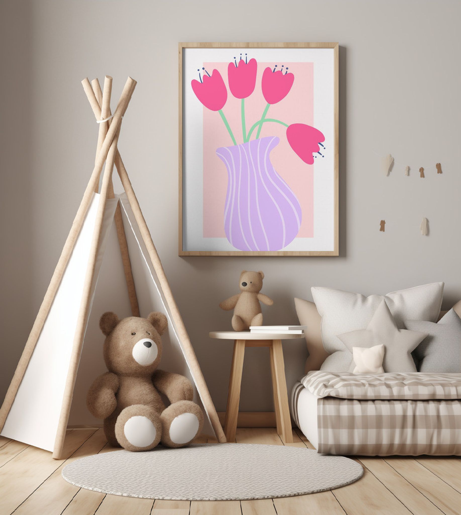 Vibrant Tulips in a Striped Lavender Vase