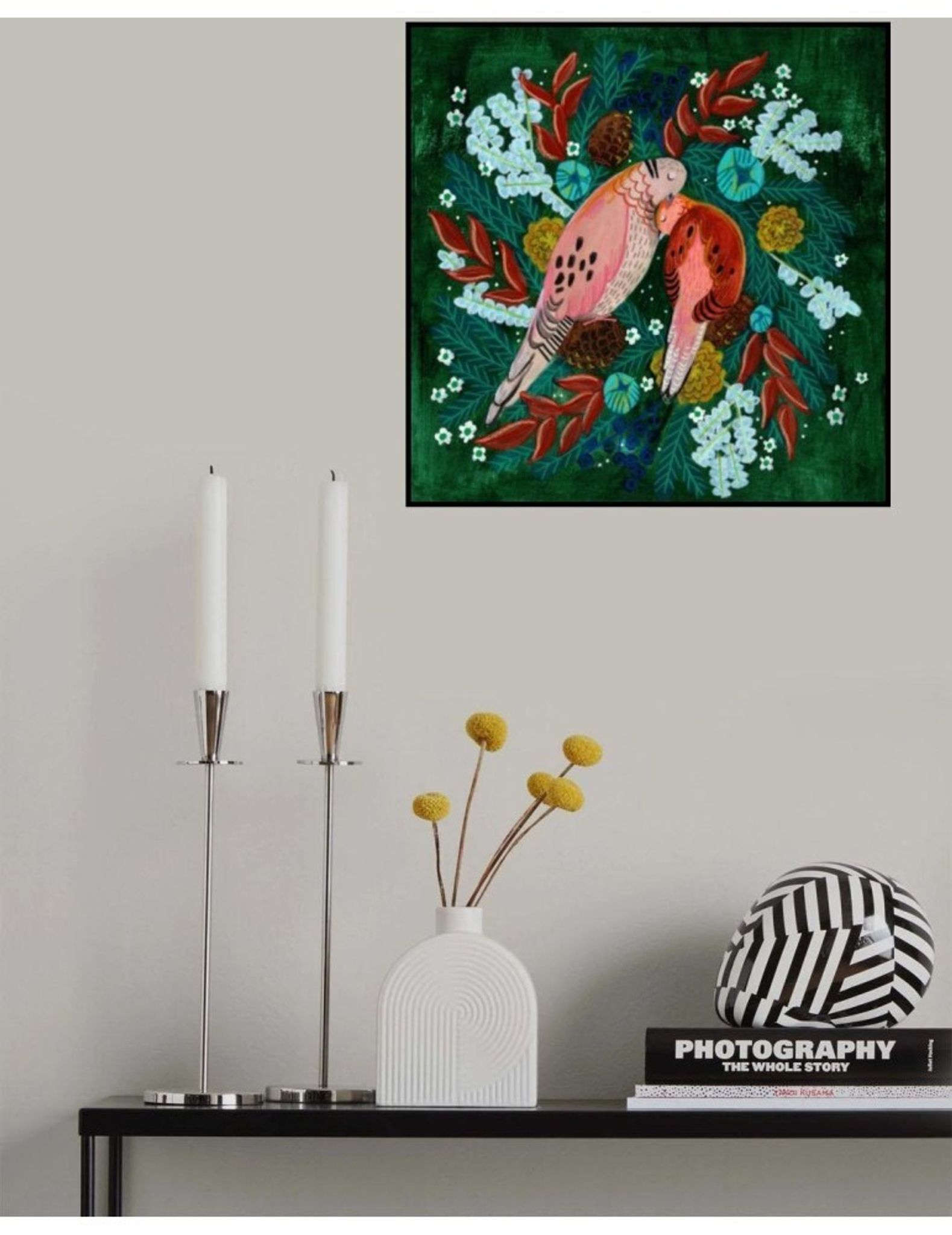 Winter Birds Turtle Dove In Green är en poster av bildskaparen Caroline BonneMuller. Postern har en Kvadrat orientering. Alla våra posters trycks på ett 200 grams matt premiumpapper med en slät finish för en förstklassig känsla. Se, njut och upplev denna högklassiga poster på din vägg hemma.