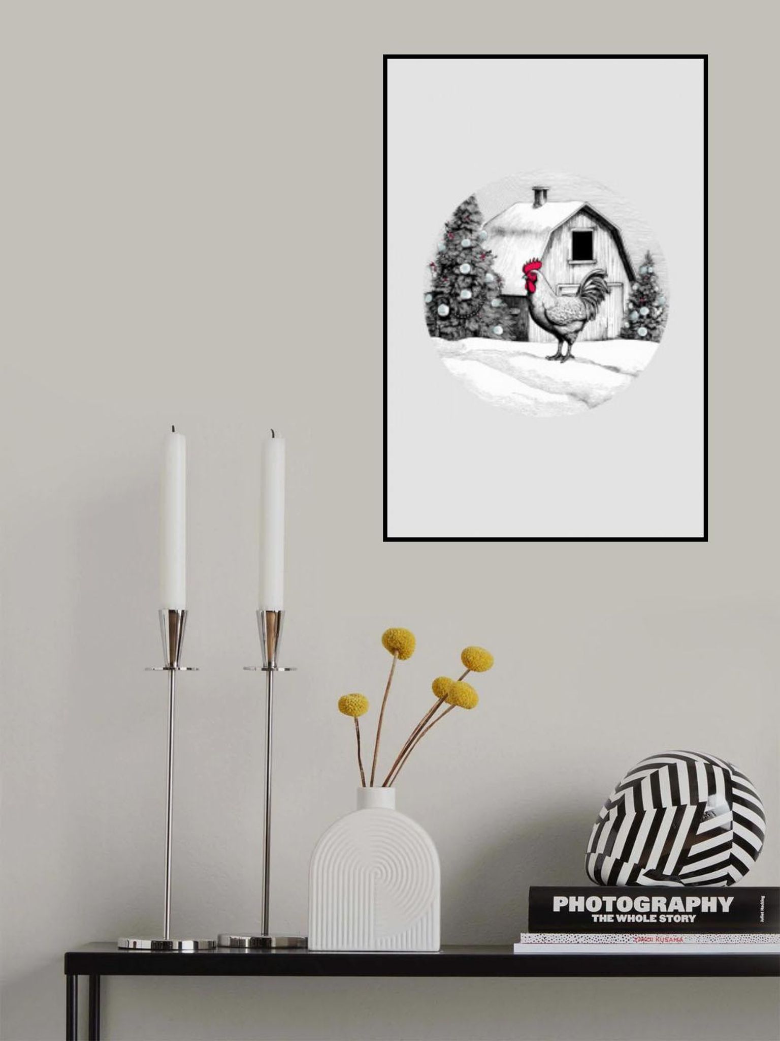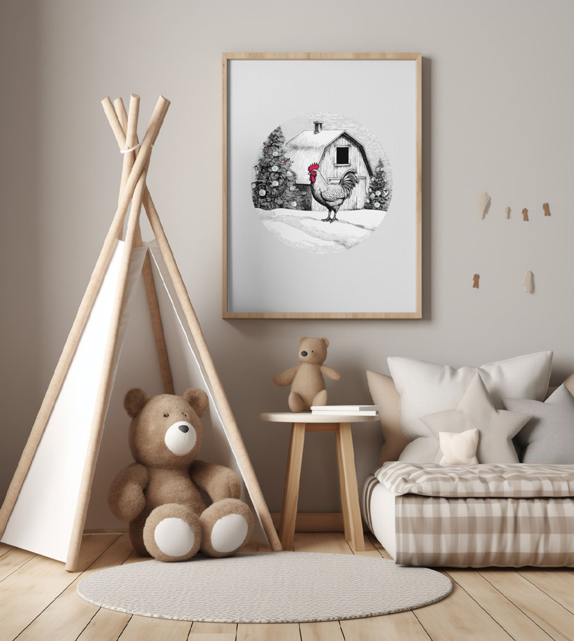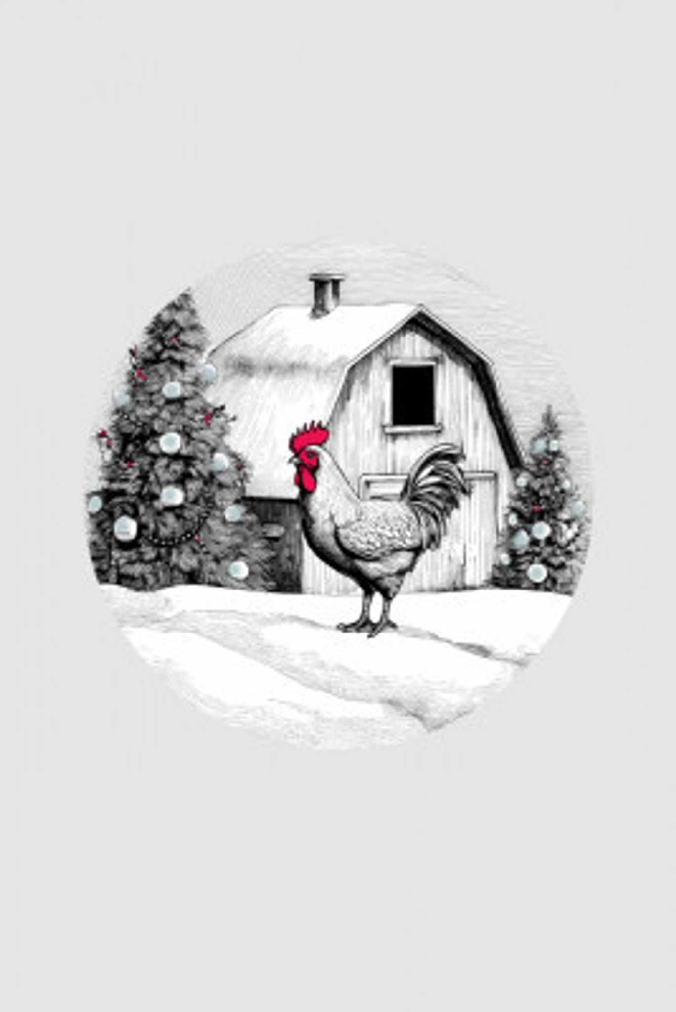 Winter Scenes: Holiday Rooster With Barn On Snow and Christmas Trees 1