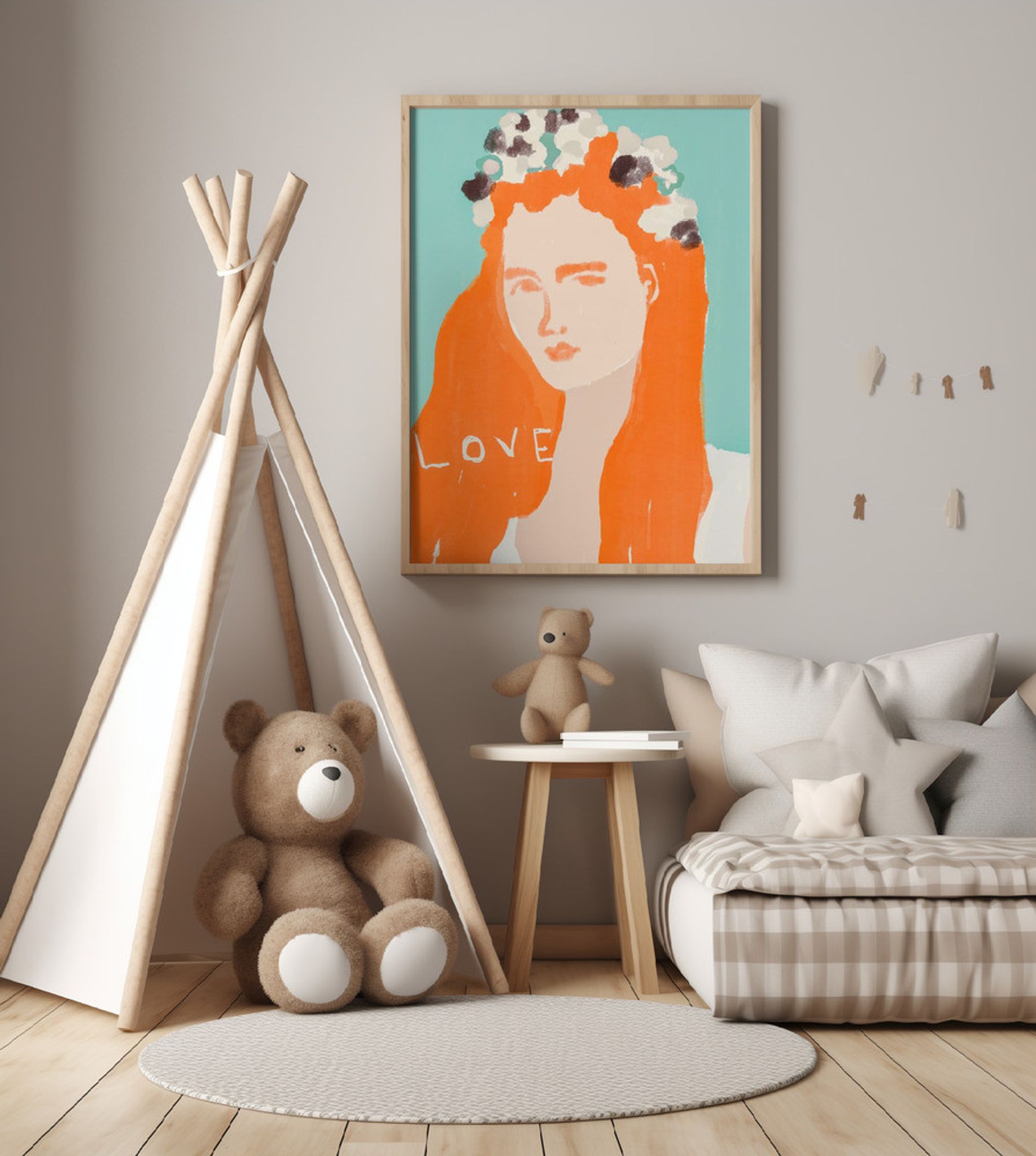 Woman with Orange Hair Adorned with Flowers